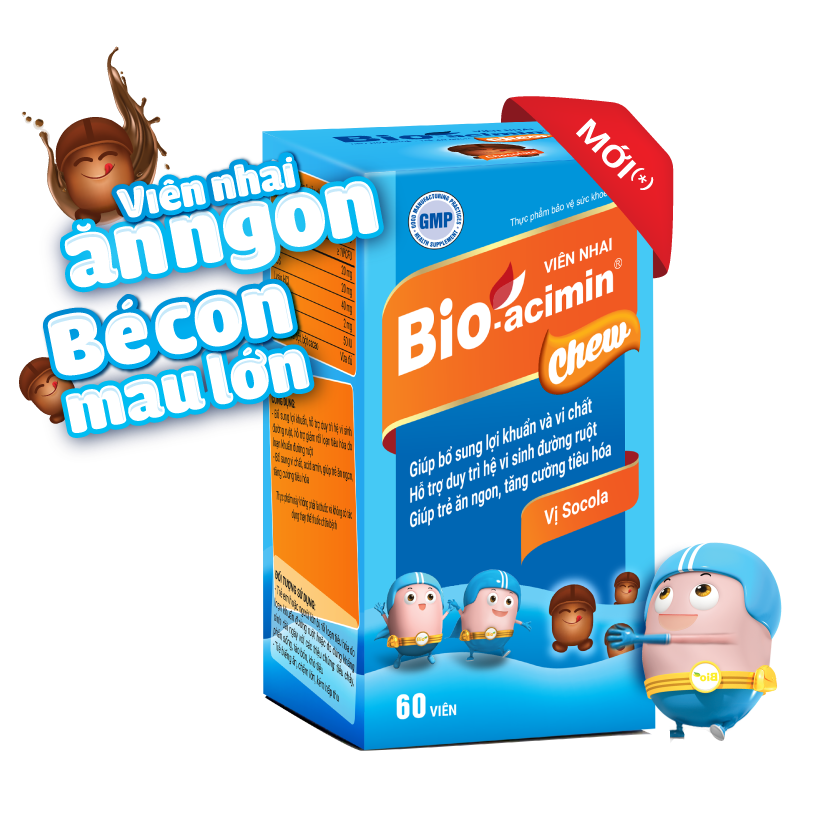 Viên nhai Bio-acimin Chew với vị Socola thơm ngon là sự kết hợp của các chủng lợi khuẩn: Lactobacillus acidophilus, Bacillus coagulans, Bacillus clausii và nấm men Saccharomyces boulardii cùng các vi chất.
